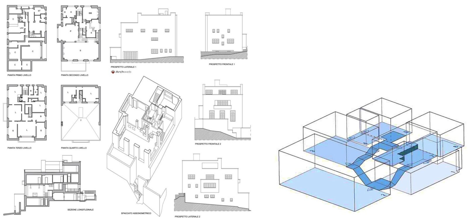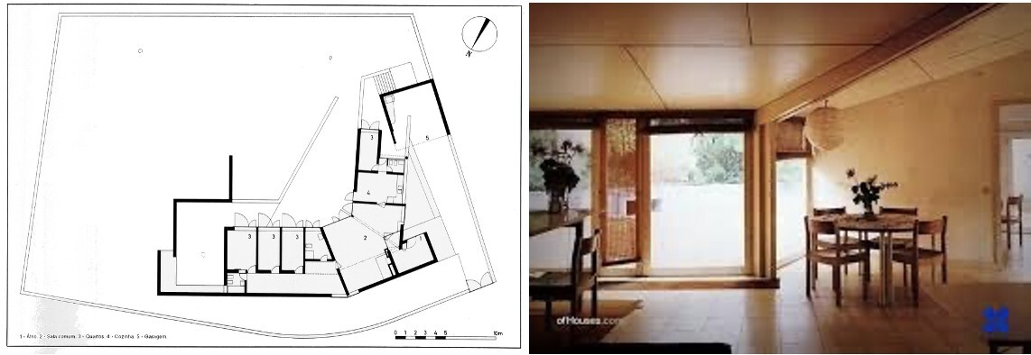Het vroege woonhuis Alves Costa van Siza ligt in een non-descript villabuurtje en Siza kiest hier conform het tijdsbeeld, net als hierboven bij Rietveld en De Vlaming, voor een ‘uitgelegde’, horizontaal gedifferentieerde haakvormige plattegrond met vertrekken die een binnentuin afschermen maar met een bijzondere doorsnede.