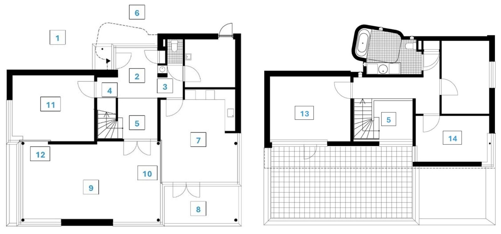 - schuifdeur vanuit de woonkamer. Als ook de schuifdeur naar de woonkeuken (10) open staat ontstaat een waaier van doorgaande, gedifferentieerde ruimtes aan de tuin.