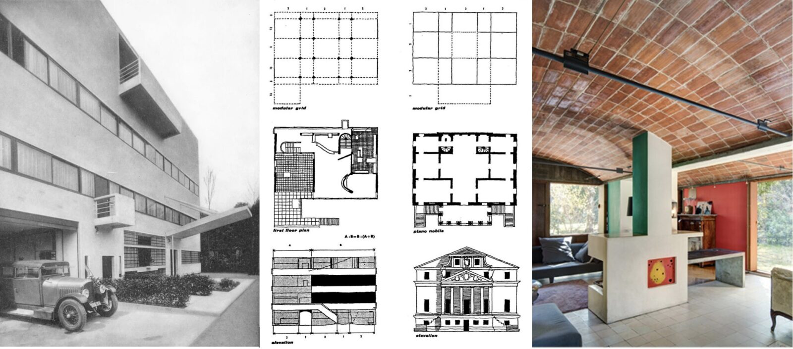 In het derdejaarsproject woningbouw-stedebouw nam Max Risselada ons mee naar Parijs en zagen we het werk van Le Corbusier. Vervolgens heb ik naar zijn vroege ruimteprincipes onderzoek gedaan (2*). Later zou Max Le Corbusier met Loos verbinden in het onderzoek ‘Raumplan versus Plan Libre’ (3*) en daar kwam het huis Stein de Monzie aan de orde (4*), volgens Colin Rowe ontworpen op een ‘Palladiaans plattegrond-schema’. Maison Jaoul, ook van Le Corbusier was een compleet ander huis maar minstens zo indrukwekkend, met Catalaanse gewelven een soort ‘boerenhuis’ midden in Parijs.