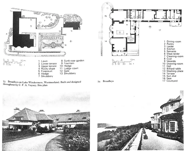 Door het uitzicht van Broadleys op lake Windermere naar het westen en wellicht door het terrein heeft dit huis echter een entree aan de zuid-oostzijde gekregen, gezien bovenstaande een lastige puzzel. De ‘drawingroom’ ligt keurig op het zuiden (aan een ‘sunk rose-garden’) met ook een erker op het uitzicht. De dubbelhoge ‘hall’ oriënteert direct (prachtig!) op het uitzicht. De ‘diningroom’ ligt ook op het westen, gekoppeld aan de dienstvleugel; die sluit het terrein aan de noordzijde af.
